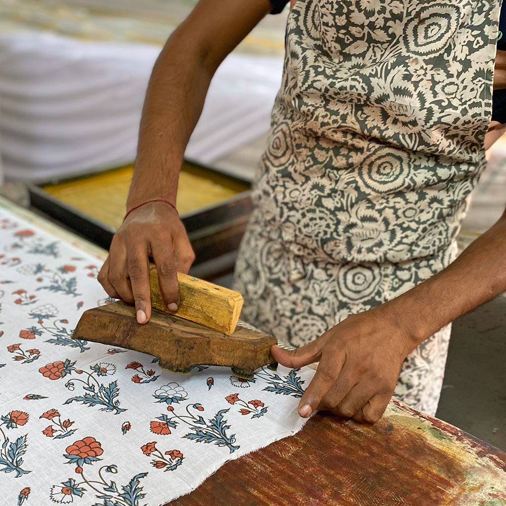 Une grande toile est tendue sur un cadre. Le coton est imprimé à la main selon la méthode ancestrale indienne. Toute la délicatesse et le talent des gestes répétés qui façonnent le motif à l’aide d’un tampon de bois gravé, chaque passage dédié à une couleur. Les contours parfois irréguliers témoignent de ce travail artisanal, chaque pièce est unique.Retrouvez notre sélection block print ici