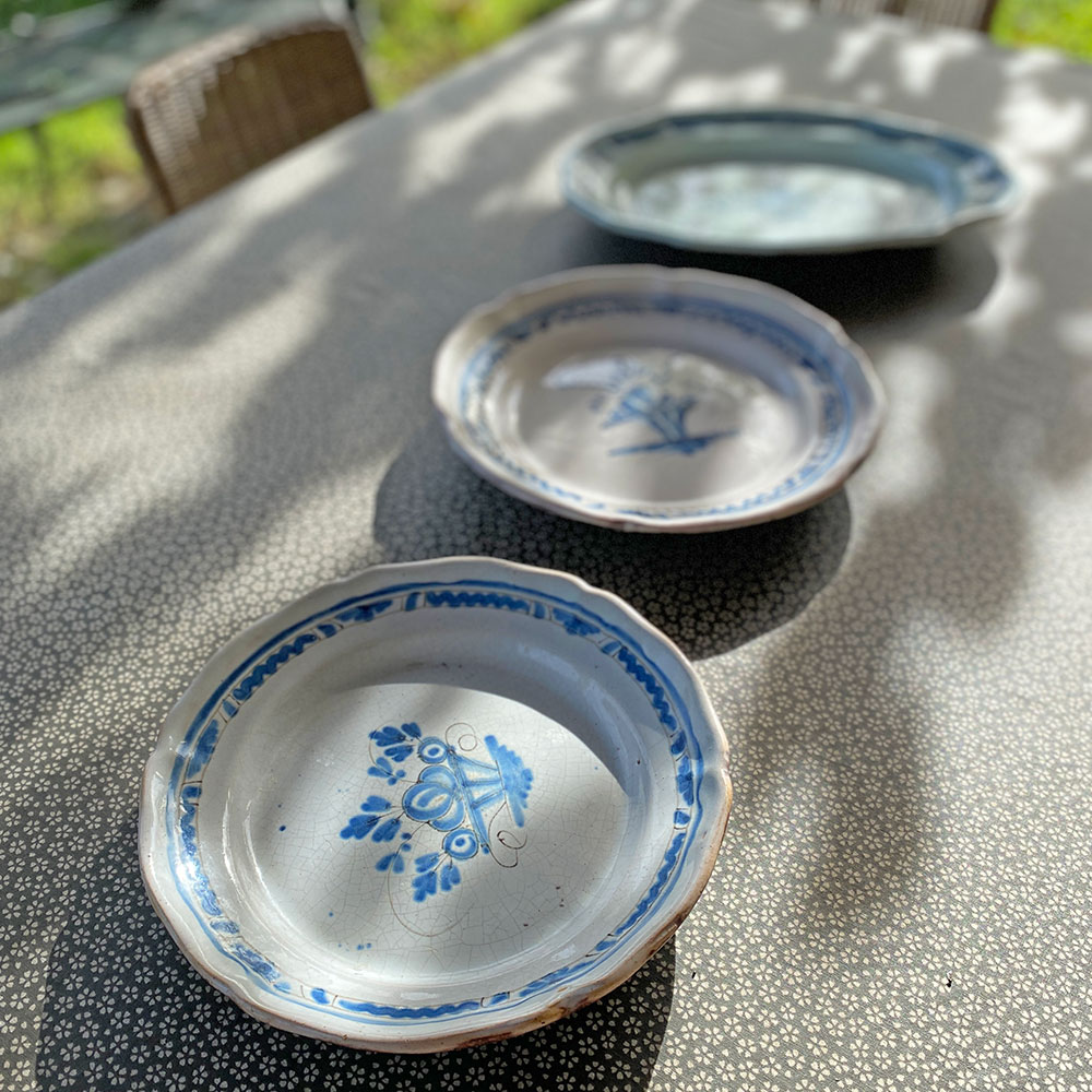 Plat rond ancien en faïence dit "cul noir" décor bleu cobalt XIXᵉ siècle