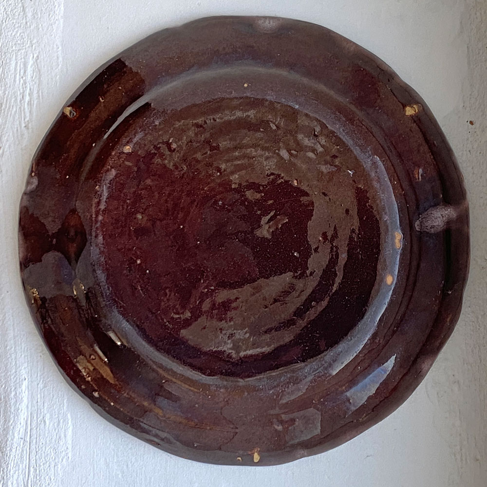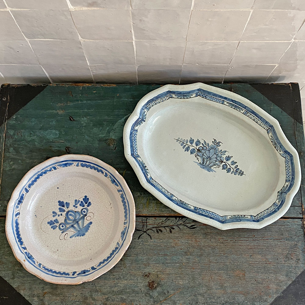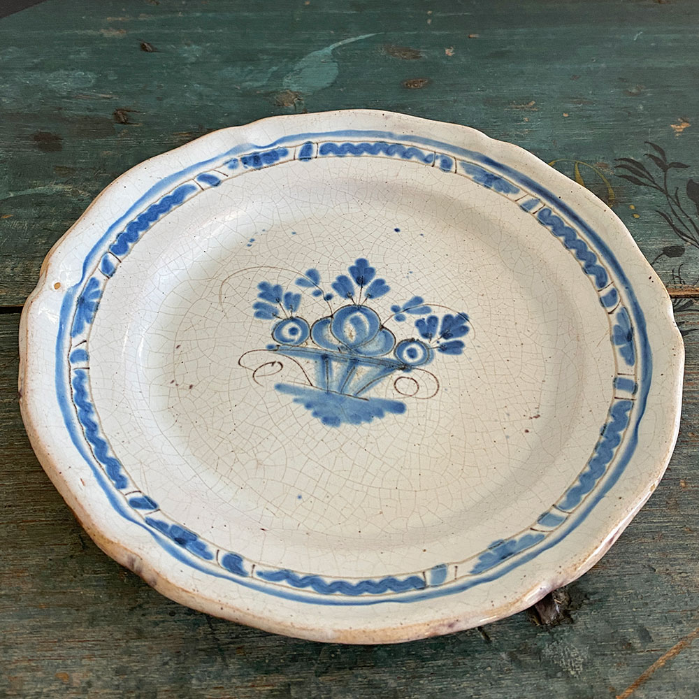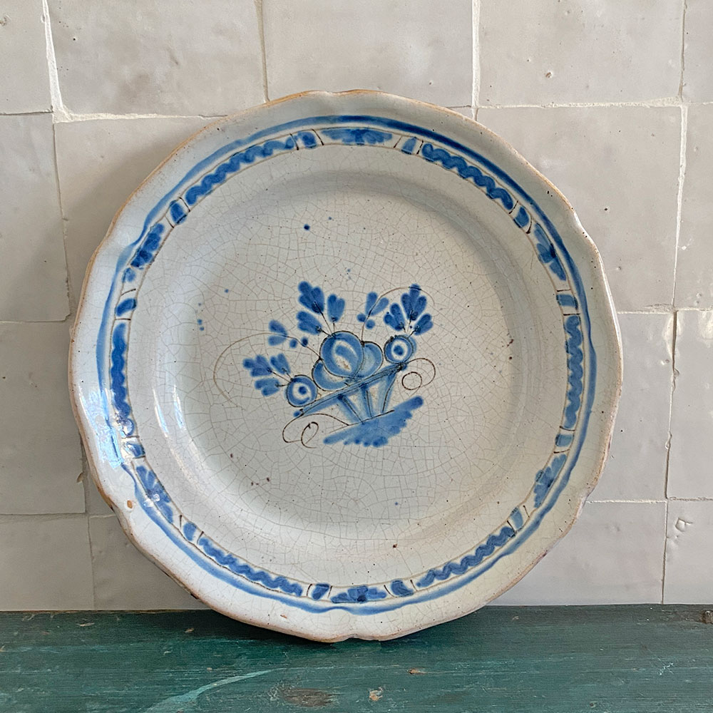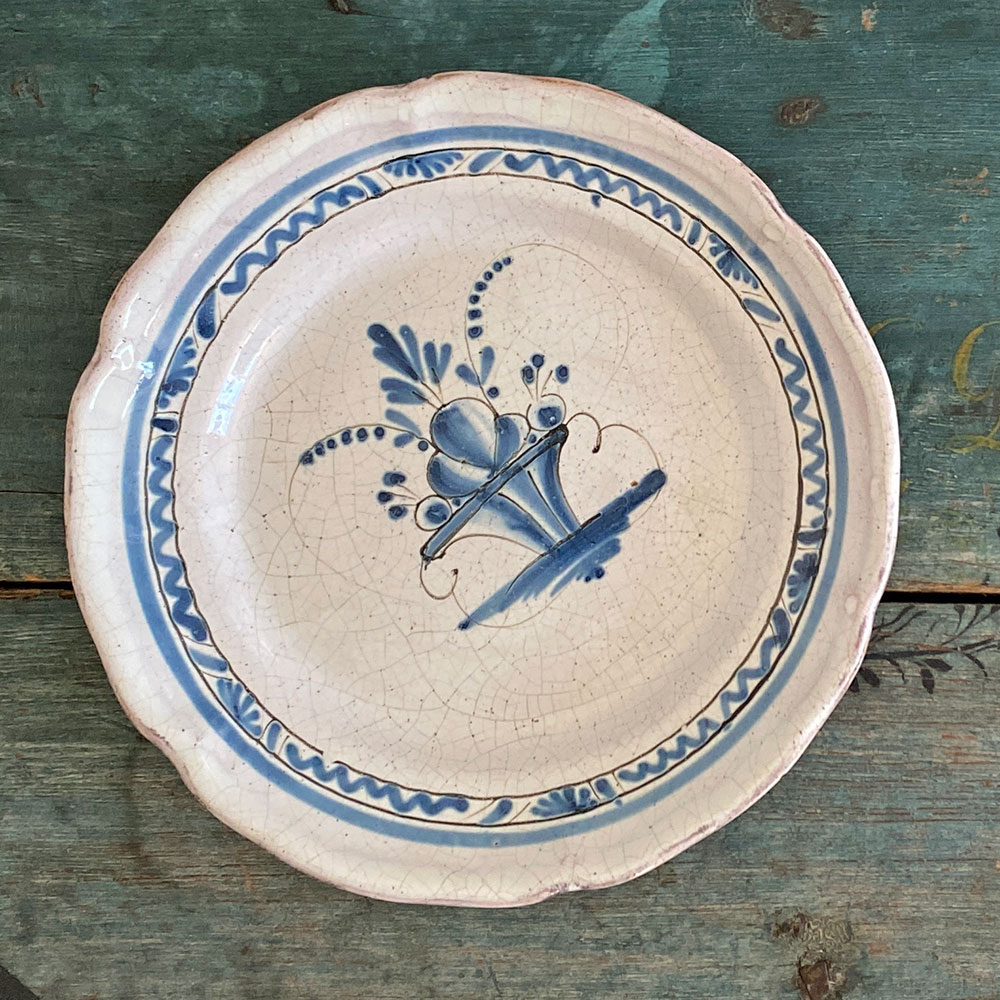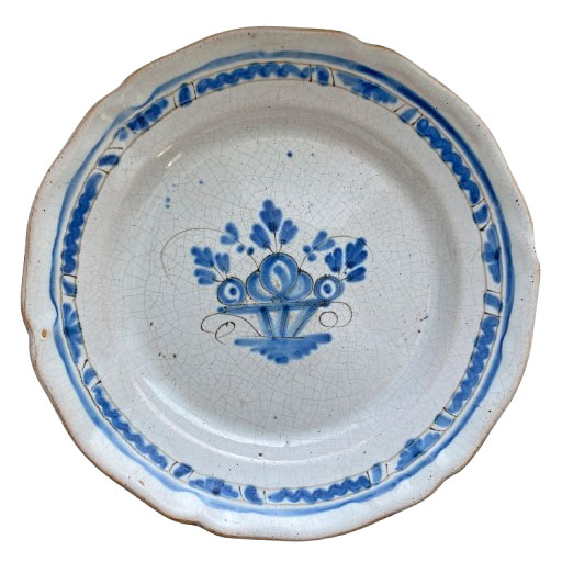 Cette pièce typique des faïences rurales françaises du XIXᵉ siècle évoque les productions de Sinceny ou Ger, connues pour leur émail craquelé et leurs décors bleus d’une grande fraîcheur. Le dessous brun vernissé (“cul noir”) est typique des faïences régionales du XIXᵉ siècle : il s’agit d’une couverte plombifère appliquée pour rendre la pièce imperméable tout en permettant une cuisson à plus basse température.