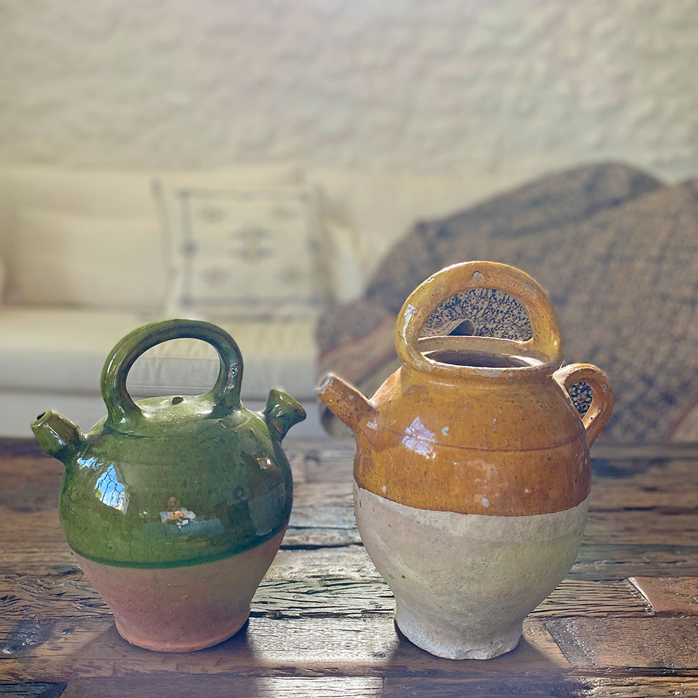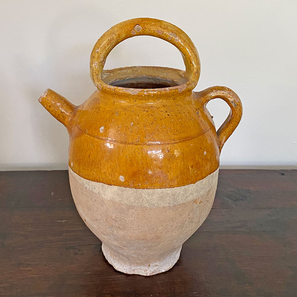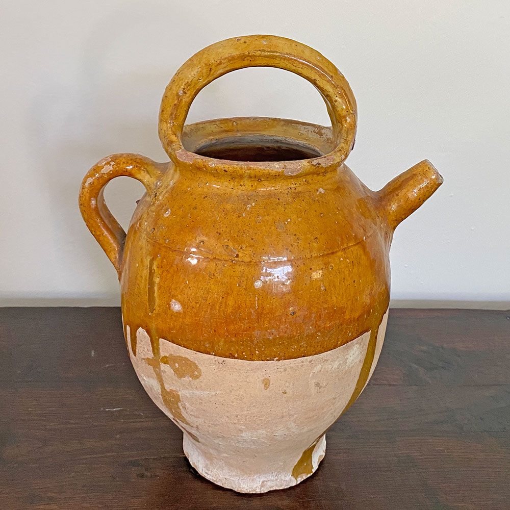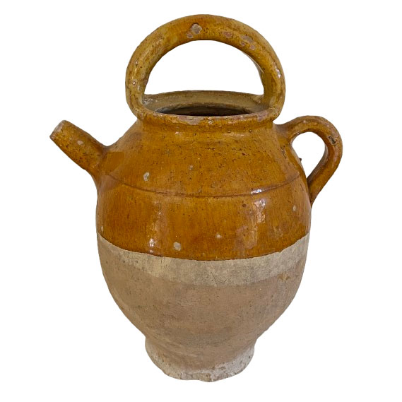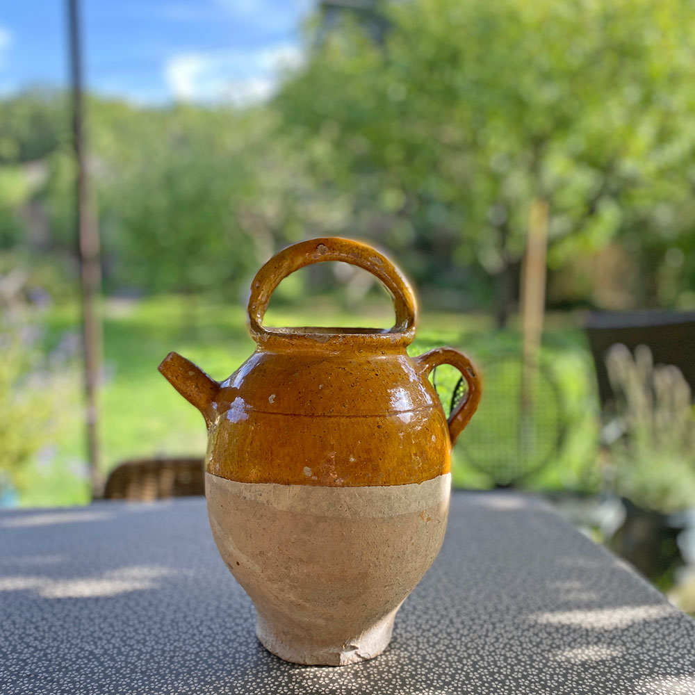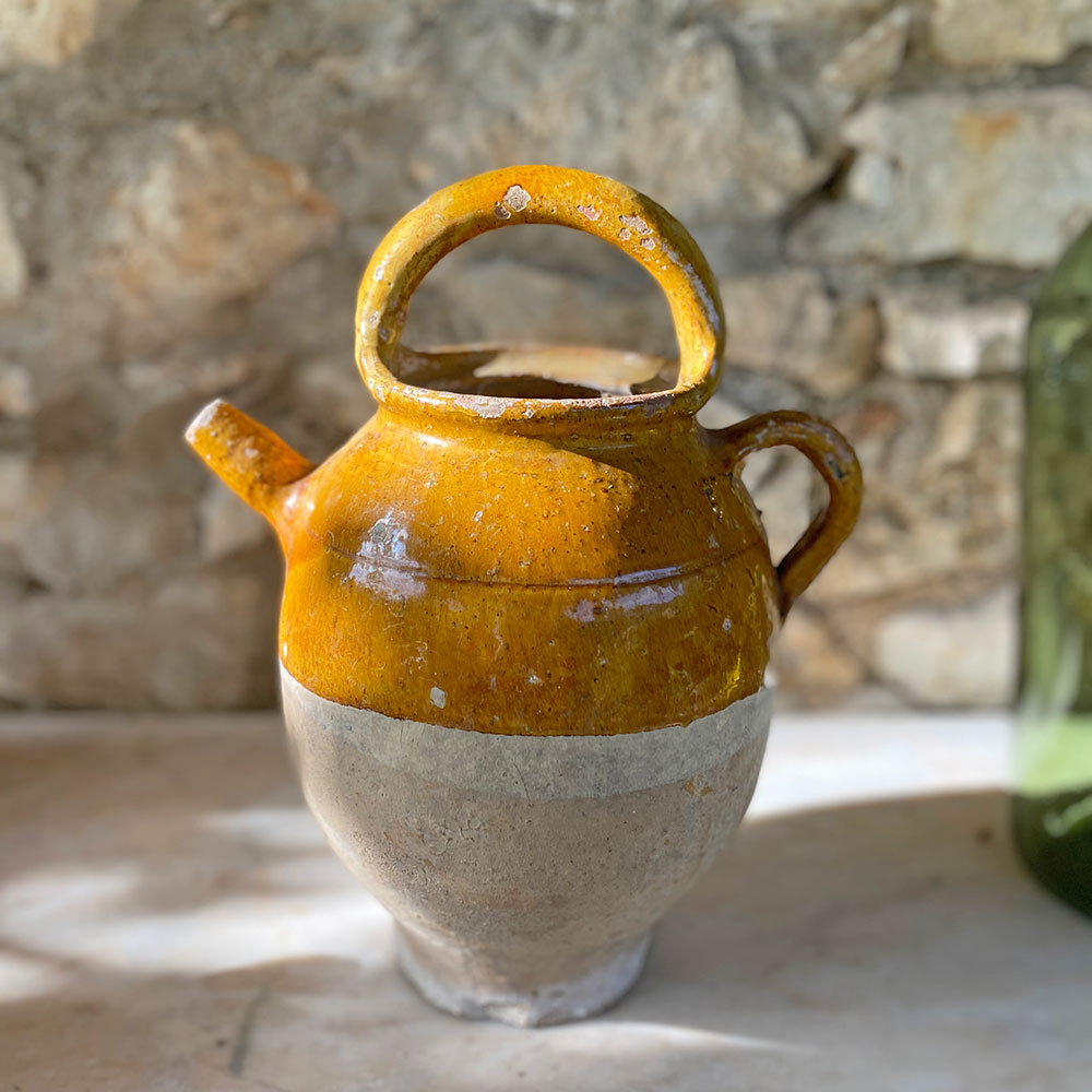 Cruche ancienne en terre cuite base brute et haut émaillé au ton vernissé ocre, appelée aussi chevrette. Céramique à panse munie d'une anse et d'un bec dressé évoquant une corne de chèvre qui était utilisée par les apothicaires pour conserver les sirops ou l'huile. Cette cruche, trouvée dans une brocante du Gard, date vraisemblablement du 19è siècle, sud de la France. On aime la belle finition vernissée ocre de ce joli accessoire déco qu'on aime accumuler, ce modèle existe aussi en vert, ou en ton chocolat.
