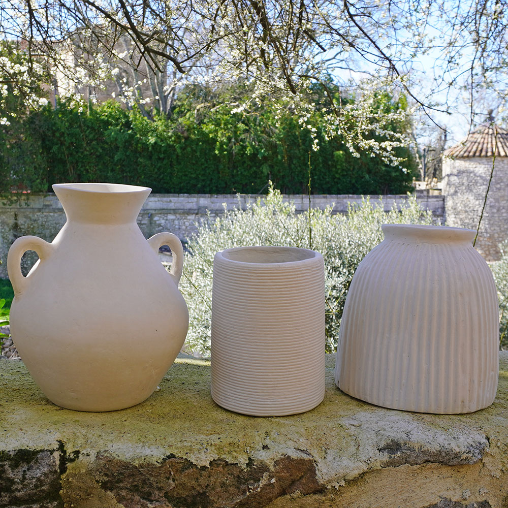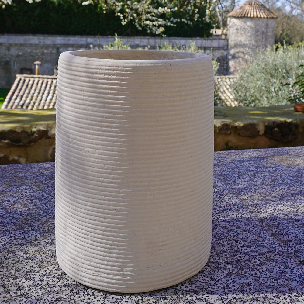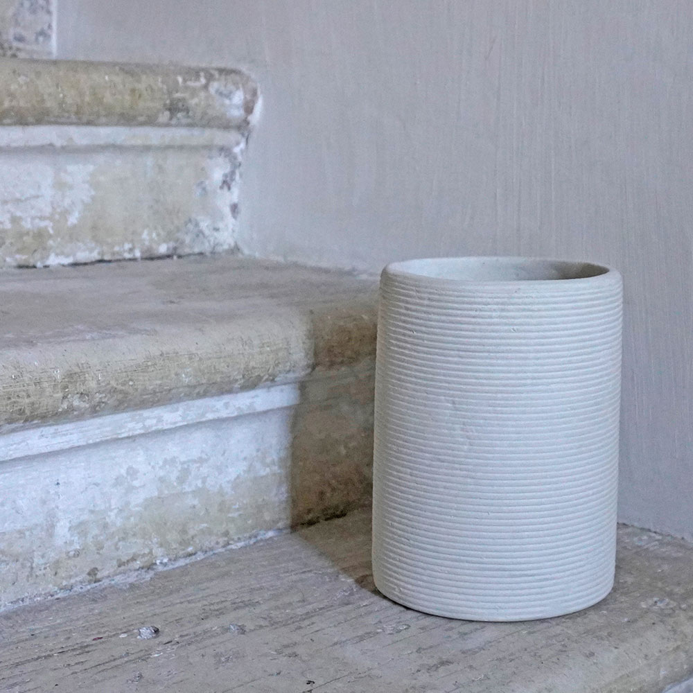 Coup de cœur pour la collection Kotah, des vases en papier mâché façonnés à la main au cœur du Rajasthan. On aime le design de ce modèle et son aspect texturé mat qui en fait un bel accessoire déco. Plusieurs formes sont proposées: amphore, évasé ou comme ici un simple tube aux stries horizontales, élégantes. Objet décoratif, aussi joli seul qu’avec un bouquet de fleurs séchées; en effet ce vase en papier ne peut pas contenir d’eau (ou en insérant une bouteille en plastique coupée si on préfère les fleurs fraîches). Ce vase est issu d’un savoir-faire indien ancestral. Le papier recyclé est broyé et malaxé dans une machine traditionnelle qui en extrait une pâte d’un ton blanc mastic. Cette pâte est coulée dans un moule de plâtre et sèche au soleil. Cela apporte cette texture veloutée, sa finition doucement brute et imparfaite.